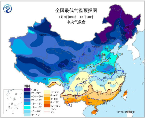 预计9~13日,黄河以南大部地区平均气温将比常年同期持续偏低4~6℃,其中,陕西中南部、河南、安徽中北部、湖北中西部等地偏低6~10℃。期间,最低气温0℃线将南压至华南北部,江南中北部最低气温-2~-7℃,陕西南部、河南、湖北北部、安徽北部等地最低气温可达-10~-15℃,局地低于-15℃,接近或突破历史同期极值。14~15日,上述地区气温将逐渐回升至接近常年水平。